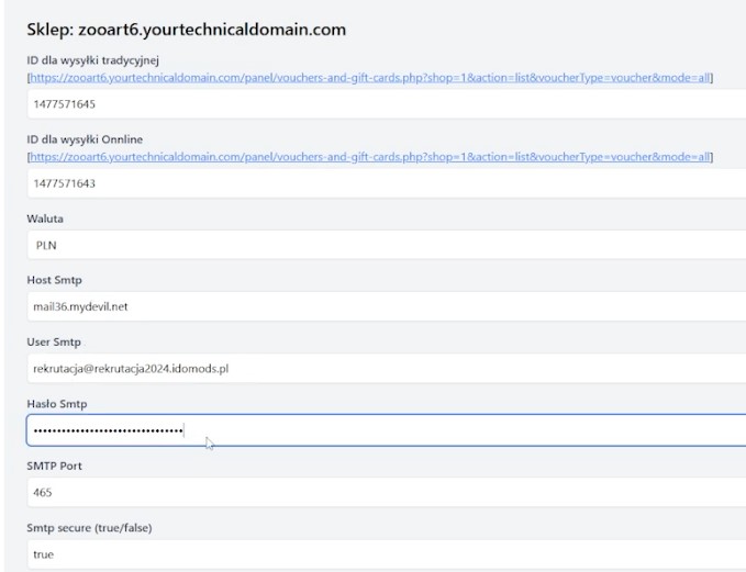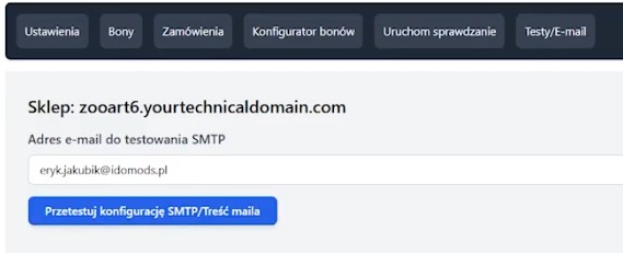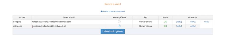 Jeśli wrócimy do konfiguracji kont e-mail dla danego sklepu, zobaczymy które konto jest oznaczone jako główne – to z tego adresu wysyłane są maile transakcyjne. Właśnie tego adresu polecam użyć również w aplikacji do generowania bonów.
