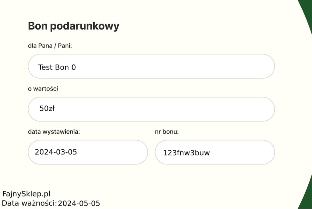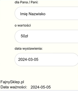 Dodałem również pola stałe, które zawsze będą widoczne na voucherze – w moim przypadku nazwa sklepu (fajnysklep.pl) oraz pole „Data ważności". Dzięki temu klient od razu widzi, kiedy bon został wystawiony i do kiedy może go wykorzystać.
