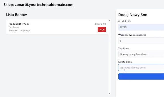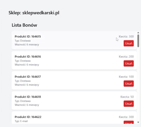 Każdy produkt-bon ma przypisany identyfikator, typ dostawy (fizyczny lub mailowy), okres ważności (na przykład 6 miesięcy) oraz kwotę (na przykład 300 zł). Takich produktów można stworzyć całkiem sporo, dla różnych wartości i form dostawy.