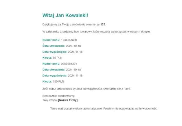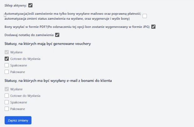 Automatyzacja – jeśli jeśli klient złoży zamówienie zawierające tylko bon towarowy, bez produktów fizycznych do wysłania, system automatycznie to wykryje, zmieni status na „wysłane", przeprocesuje całe zamówienie i je zamknie.