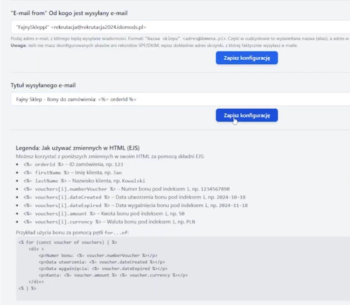 Gdy mamy już uzupełnione identyfikatory kampanii, kolejnym krokiem jest ustawienie waluty, w jakiej mają być generowane bony, oraz wskazanie adresu e-mail, z którego będą wysyłane do klientów.