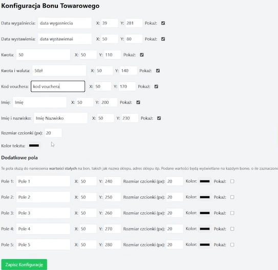 W konfiguracji bonu mamy różne pola, które będą automatycznie podstawiane w zależności od tego, co chcemy na nim umieść. Oto przykładowe dane: