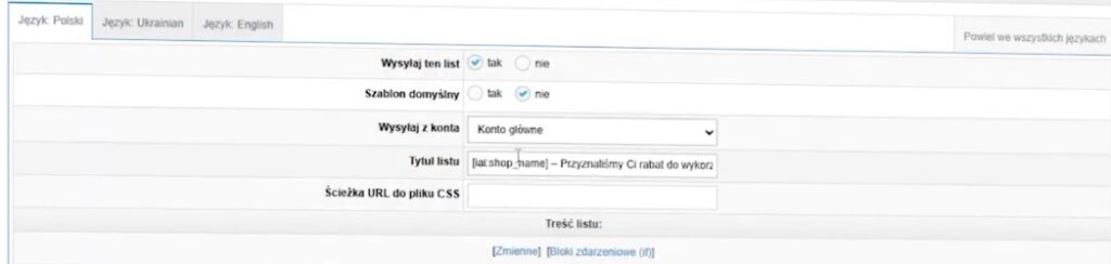 Sklep aktywny – to podstawowy checkbox. Jeśli nie będzie zaznaczony, aplikacja nie będzie wysyłać maili, nawet jeśli jest włączona. Dopiero po zaznaczeniu tej opcji automatyzacja zacznie działać.