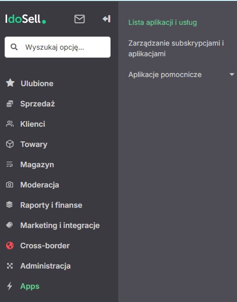 Zacznijmy od instalacji aplikacji. Przechodzimy do panelu IdoSell, wchodzimy w Apps → Lista aplikacji i usług.