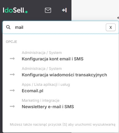 Do konfiguracji potrzebujemy standardowych danych wymaganych przy wpinaniu skrzynki pocztowej do panelu IdoSell. Najłatwiej jest przejść do: Konfiguracja kont e-mail i SMS (wyszukując lupką w panelu) – z tego poziomu możemy sprawdzić, jaki adres mamy podpięty do kontaktu z klientem.
