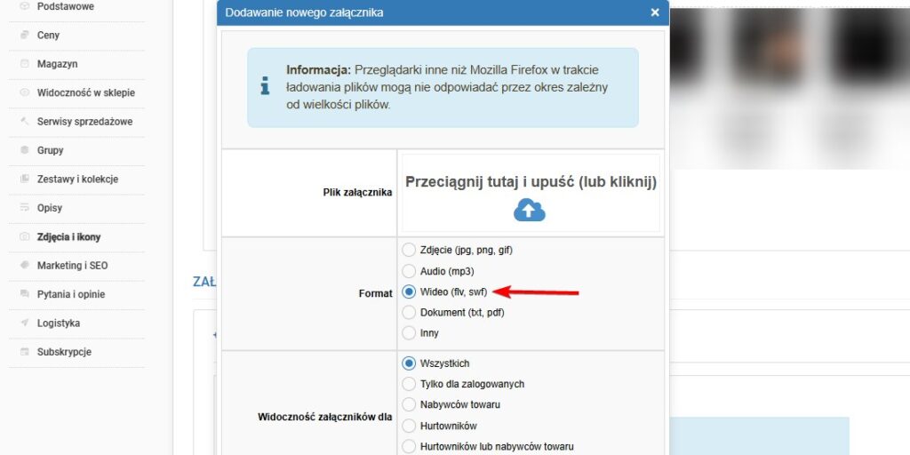 W opcjach typu załącznika wybierz "Format wideo". Ta opcja pozwala systemowi odpowiednio przetworzyć i wyświetlić Twój materiał filmowy w galerii produktu.