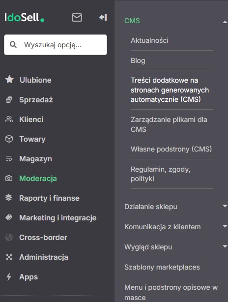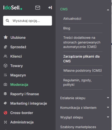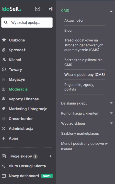 Zacznijmy od podstron CMS. Aby się do nich dostać, przechodzimy do sekcji Moderacja → CMS → Własne podstrony CMS. W tym miejscu mamy możliwość dodawania własnych kodów, które pozwalają zmieniać wygląd sklepu.