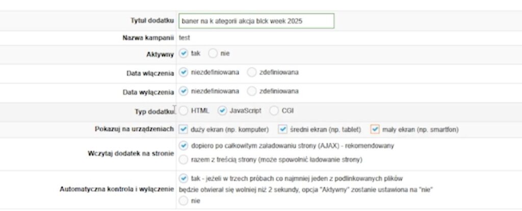 Nazywamy go na przykład: „Baner na kategorii – akcja Black Week 2025". Wybieramy typ JavaScript. Ustawiamy, że ma się ładować wszędzie i na każdym urządzeniu – choć warto pamiętać, że jeśli baner jest przygotowany tylko pod desktop, na mobile może wyglądać źle. Można wtedy stworzyć osobne wersje dla różnych urządzeń.