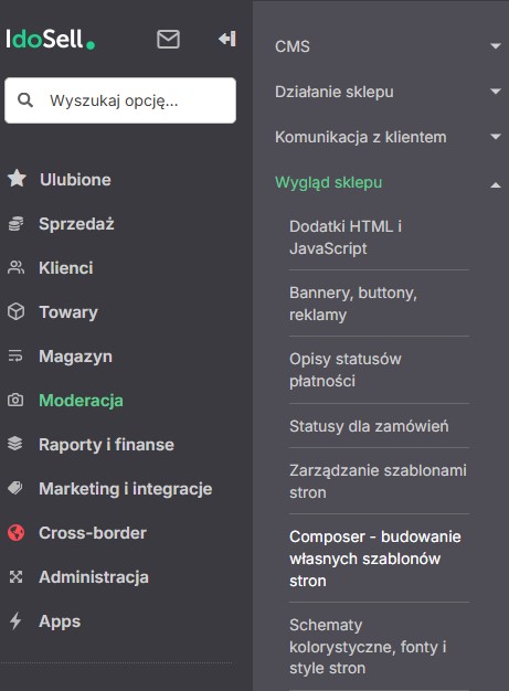 Oczywiście warto też wspomnieć o Composerze. To jednak moduł dla zaawansowanych, np. programistów. Jeśli nie mamy doświadczenia, lepiej nic nie modyfikować na własną rękę, bo można sporo popsuć. Wchodzimy w Moderacja → Wygląd sklepu → Composer - budowanie własnych szablonów stron.