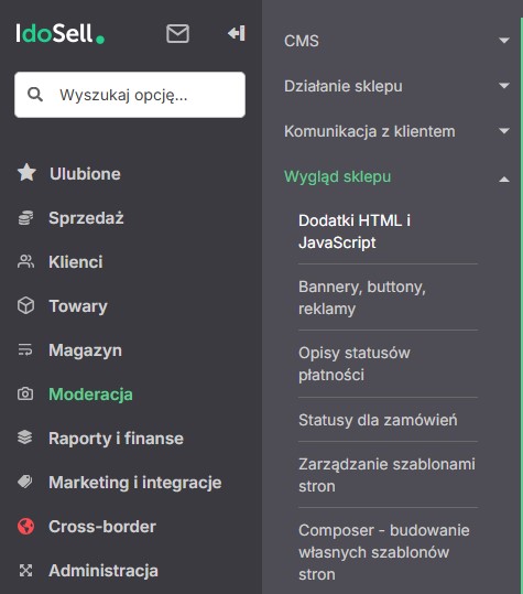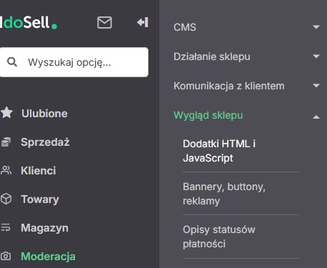 A teraz pokażę opcję, którą uważam za najlepszą – Dodatki HTML i JavaScript. Przechodzimy tam przez Moderacja → Wygląd sklepu → Dodatki HTML, JavaScript.