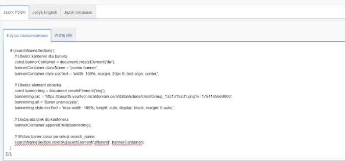 Możemy także wejść w: Moderacja → Wygląd sklepu → Bannery, buttony, reklamy. Teoretycznie w tym miejscu również da się wstawić kod, który zmodyfikuje wygląd sklepu, nie polecam jednak tej metody. Do wprowadzania zmian w kodzie są znacznie lepsze opcje, które przedstawię w dalszej części wpisu.