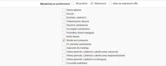 Na koniec zaznaczamy, że dodatek ma się ładować w wynikach wyszukiwania – w IdoSell oznacza to również podstrony kategorii, czyli wszędzie tam, gdzie są listy produktowe.