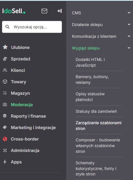 Kolejne miejsce do edycji to zarządzanie szablonami strony. Wchodzimy tam przez Moderacja → Wygląd sklepu → Zarządzanie szablonami stron.